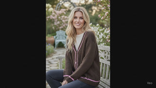 Elevate your everyday style with our Cozy Knit Cardigan. Crafted in Italy, this charming brown cardigan features a distinctive pink trim that adds a playful pop of color. Its soft, textured knit promises warmth and comfort, making it a versatile layering piece for any occasion. Designed to fit a range of body types, this cardigan is available in sizes from small to large, ensuring a relaxed and flattering silhouette.