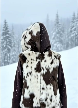 A cozy, hooded vest featuring a distinctive brown and cream cow print (or mottled) pattern in soft faux fur. It has a zip-front closure and a solid brown lining. It's a stylish layering piece that adds texture and warmth,making it a perfect statement piece for layering.